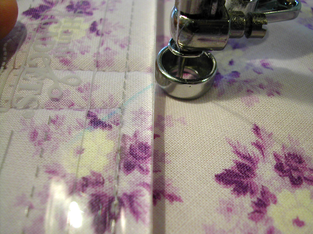 This is me quilting parallel line to green square and starting from the corner of purple one. I put the needle down on the corner, placed the ruler beside the foot and made sure ruler is parallel to the green square.