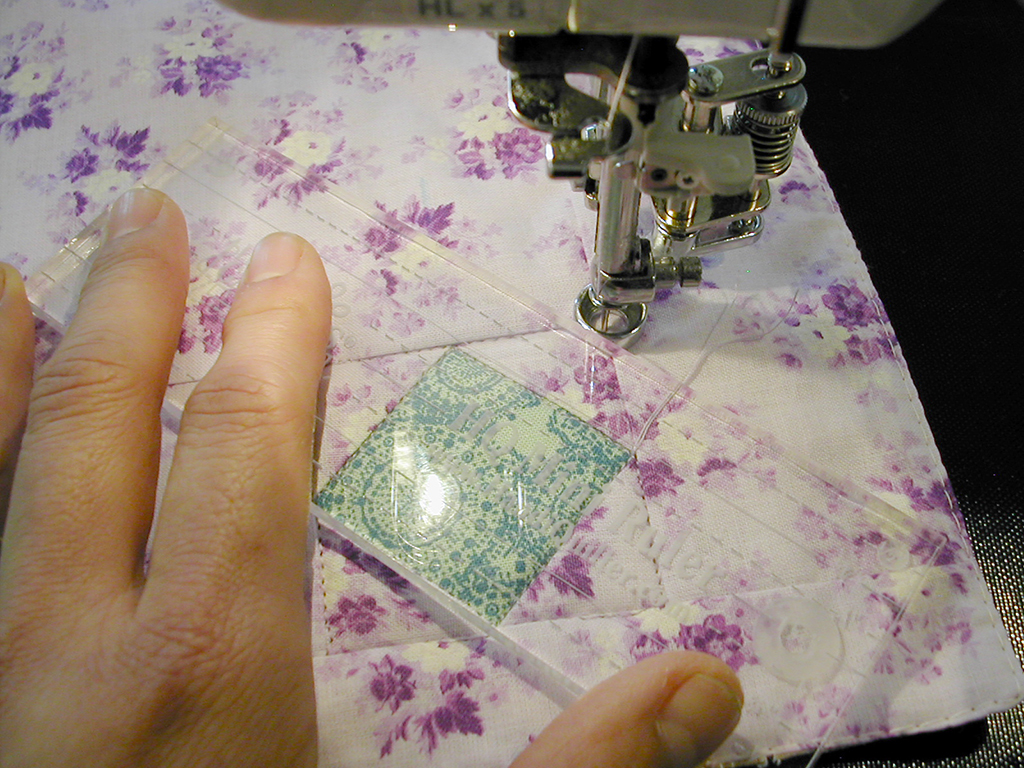 You hold a ruler against the foot and move the quilt and ruler together along the foot. You can place the ruler left, right or front of foot and any angle as you like. Technically you can place it even behind the foot but I don't do it because it is beyond awkward.
